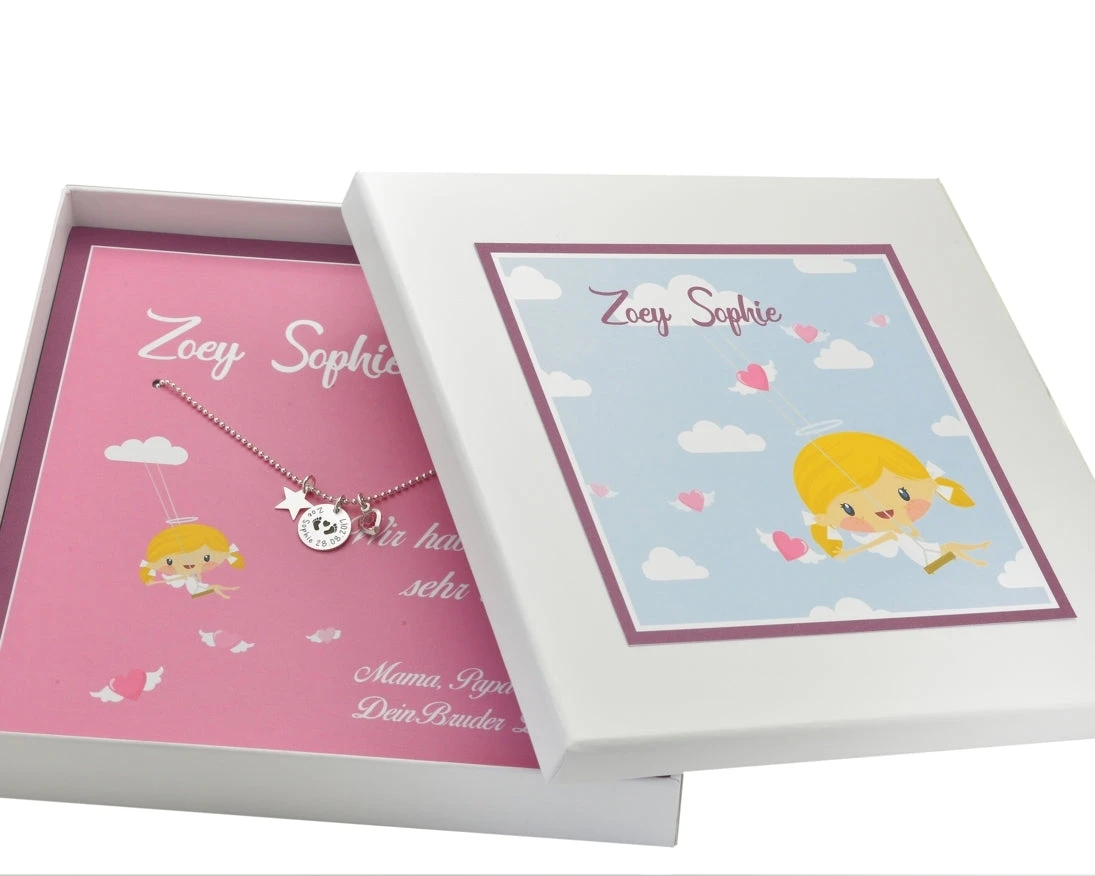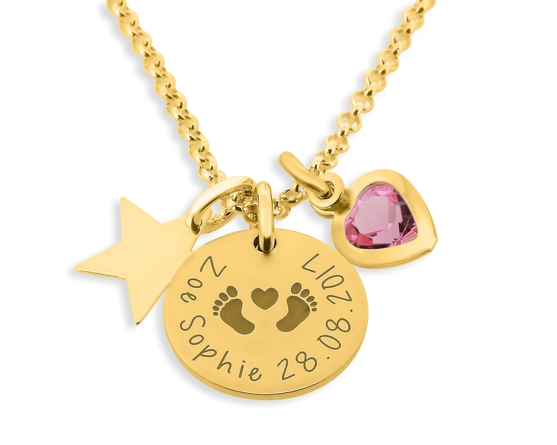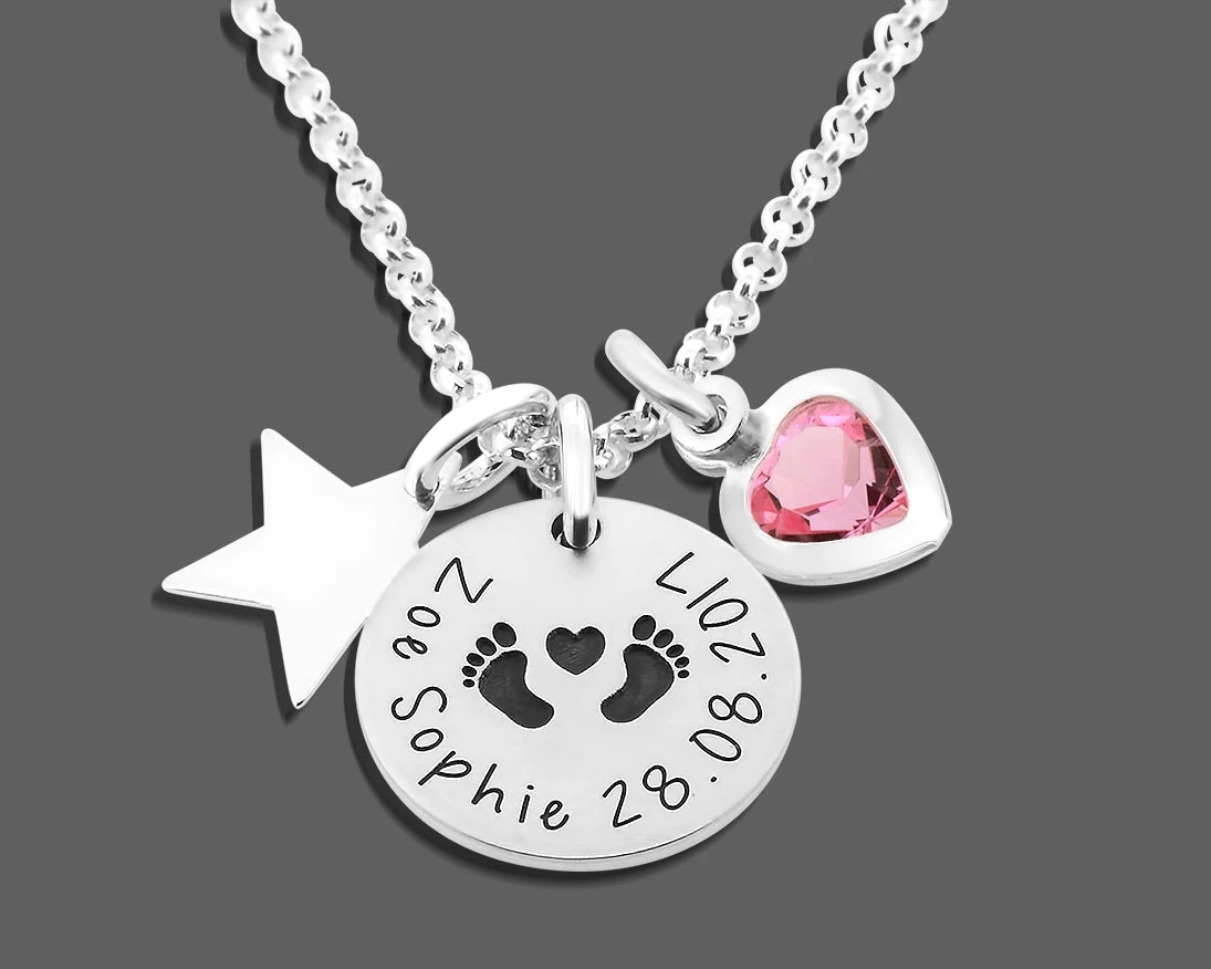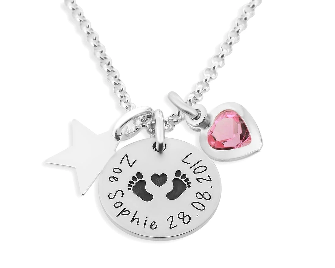 Eine wunderschöne Kette aus 925 Sterling Silber mit Anhängern. In der Mitte vom Plättchen sind die Motive „Babyfüße und Herz“ graviert. Das 925 Sterling Silber Plättchen ist ca. 1,3 cm groß. Es passen max. 21 Zeichen inkl. Leerzeichen am Rand geschrieben für Ihren Wunschnamen bzw. Wunschtext auf das Plättchen. Daneben designen wir einen bezaubernden Stern sowie ein Kristall Herz aus 925 Sterling Silber. Das Schmuckstück wird in einer nach Ihren Wünschen personalisierten Geschenkbox verpackt.