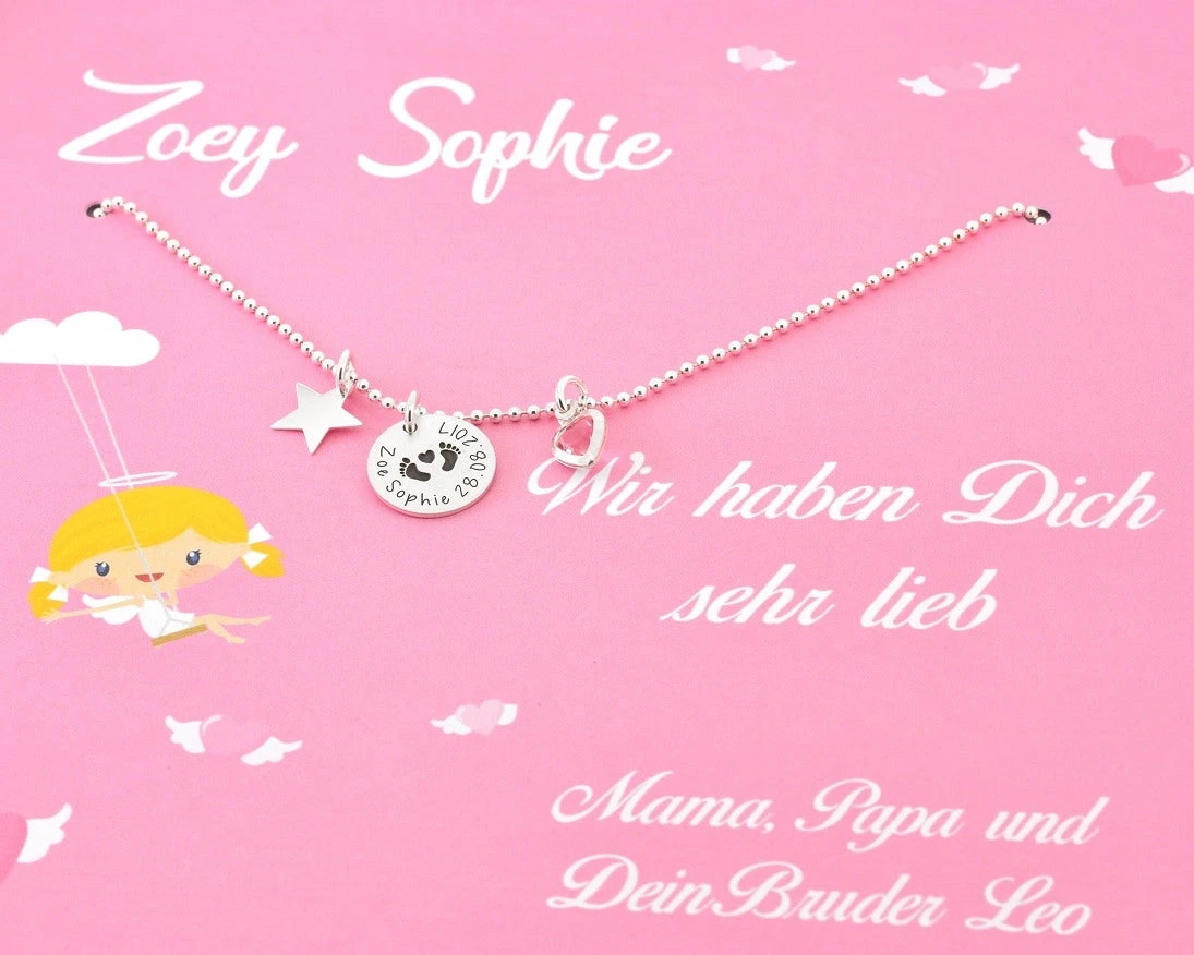 Eine wunderschöne Kette komplett aus 925 Sterling Silber mit einem 925 Sterling Silber Plättchen ( ca. 1,3cm groß) mit Ihrem Wunschnamen bzw. Wunschtext (maximal 21 Zeichen inkl. Leerzeichen) designed. Auf dem Plättchen sind niedliche Babyfüßchen und ein wunderschönes Herz graviert. Daneben hängt ein bezaubernder Sternanhänger sowie ein Kristall Herz aus 925 Sterling Silber.