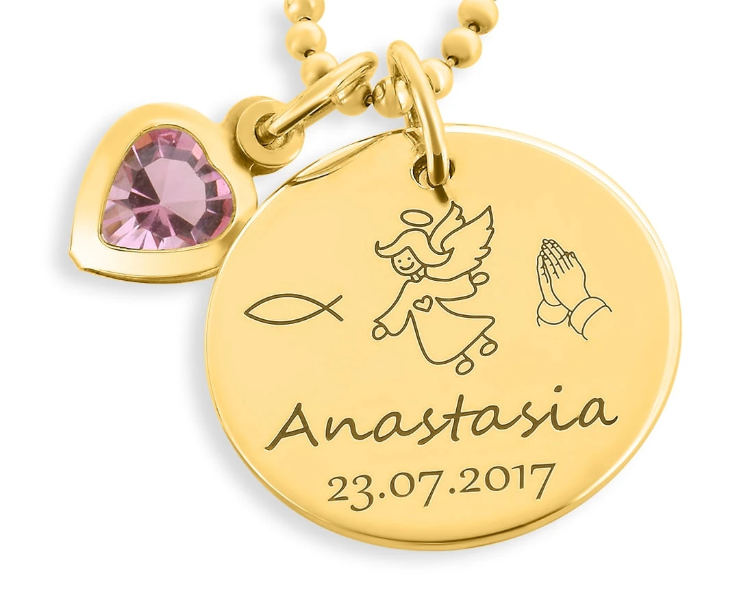 Eine wunderschöne Kette aus 925 Sterling Silber hochwertig vergoldet und designed mit Ihren Wunschnamen bzw. Wunschdatum. Das 925 Sterling Silber Plättchen ist ca. 1,7 cm groß. Es passen max. 28 Zeichen inkl. Leerzeichen mittig geschrieben für den Namen und ein Datum auf das Plättchen. In der Mitte vom Plättchen sind die Motive „Tauffisch, Engel, Hände“ graviert. Daneben hängt ein 925 Sterling Silber Kristall als Herz in rosa.