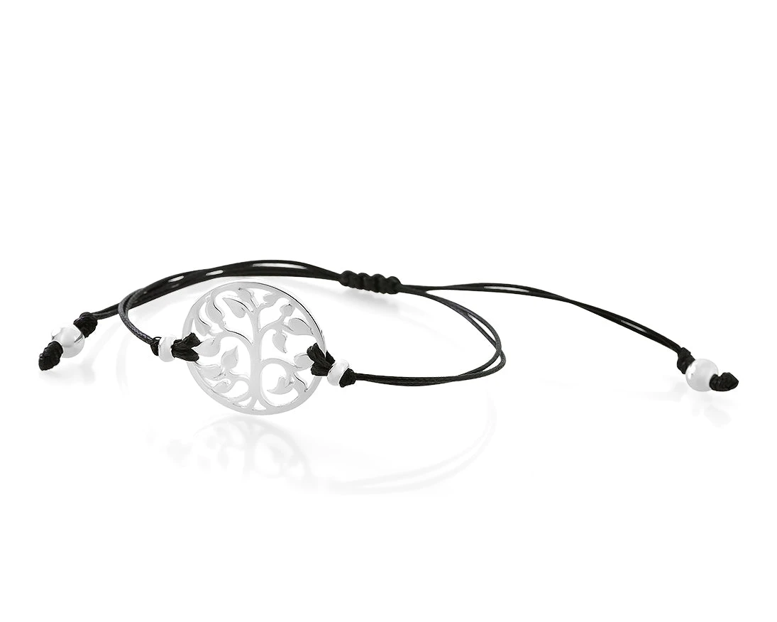Ein schönes, schlichtes Armband in schwarz. Das Band ist aus Baumwolle. In der Mitte ist ein wunderschöner Lebensbaum eingefasst. Alle Metallelemente sind aus 925 Sterling Silber.