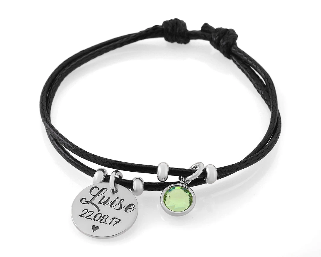 Ein schönes, zartes, farblich veredeltes Baumwollband mit 925 Sterling Silber Anhängern. An dem Band hängt ein 925 Sterling Silber Namensplättchen und ein Swarovski Geburtsstein in Ihrer Wunschfarbe. Die Ösen werden von uns fachmännisch gelötet. Auf dem Gravurplättchen kann Ihr Wunschtext oder Name graviert werden.