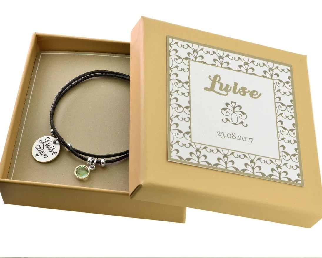 Ein schönes, zartes, farblich veredeltes Baumwollband mit 925 Sterling Silber Anhängern. Dieses exklusive Schmuckstück wird in einem bezaubernden, nach Ihren Wünschen personalisiertem, hochwertigem Geschenkkarton mit Ihrem Wunschtext nach Ihren Wünschen von unserem Designer Team angefertigt. Die Geschenk Schachtel ist ca. 80x80mm groß.