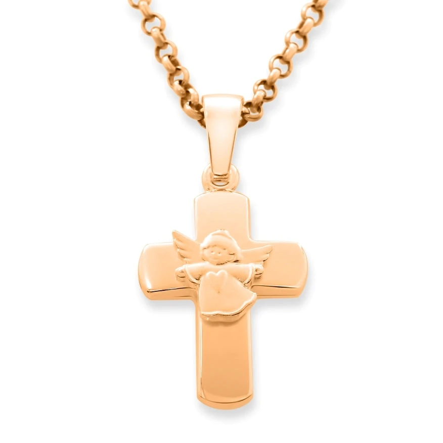 Ein polierter Kreuz Anhänger mit einer Kette aus 925 Sterling Silber. Auf der Vorderseite des Kreuzes ist ein bezaubernder, fliegender Engel designed, welcher zum Blickfang wird. Das Schmuckstück wird in Juwelierqualität hochwertig rosé vergoldet.