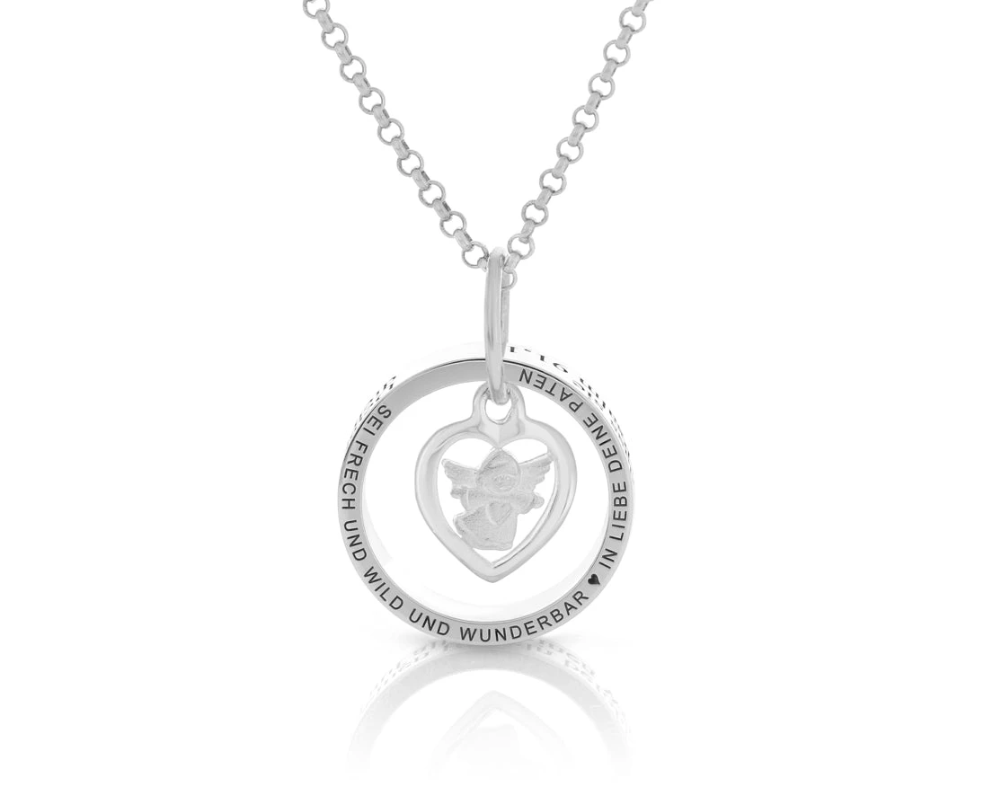 Ein wunderschöne Kette mit Ring Anhänger aus 925 Sterling Silber. In dem Ring hängt ein Herz Engel Anhänger aus 925 Sterling Silber.