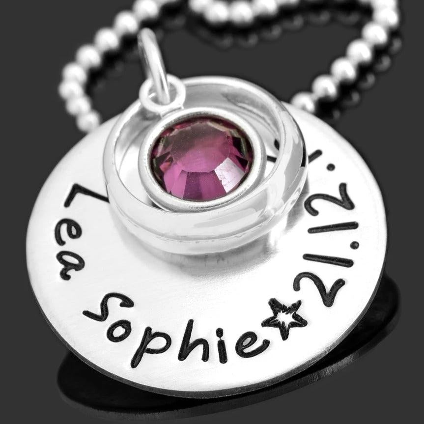 Ein handgefertigter 925 Sterling Silber Anhänger mit einem edlen 925 Sterling Silber Taufring und Swarovski Geburtsstein. Das untere Plättchen wird mit Ihrem Wunschnamen bzw. Wunschdatum gestempelt. Der Anhänger ist ca. 2cm groß. Der Taufring ist massiv.